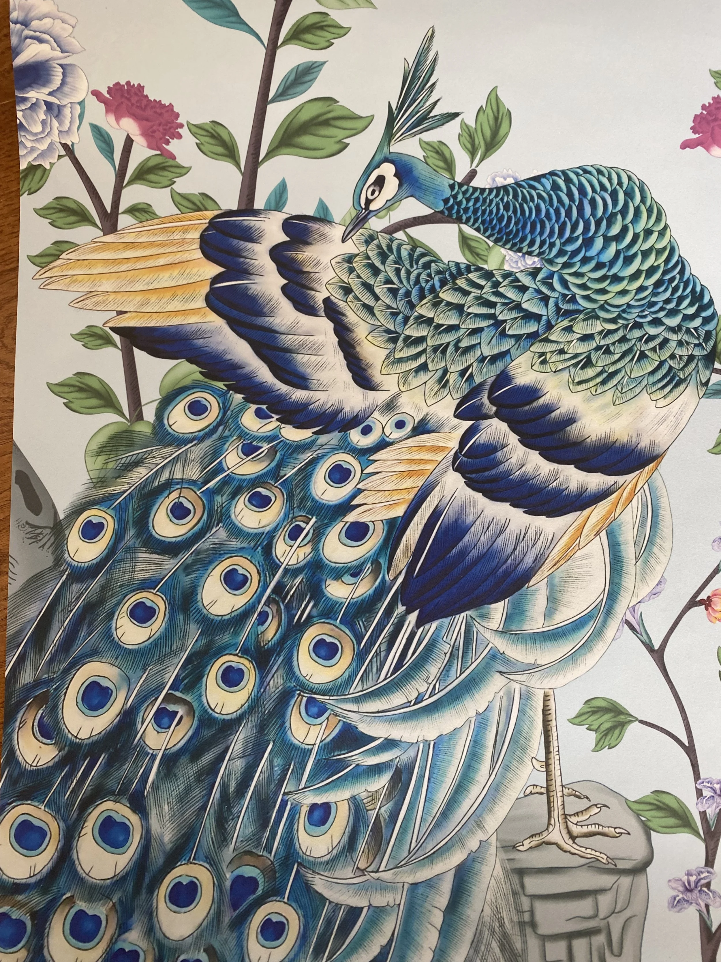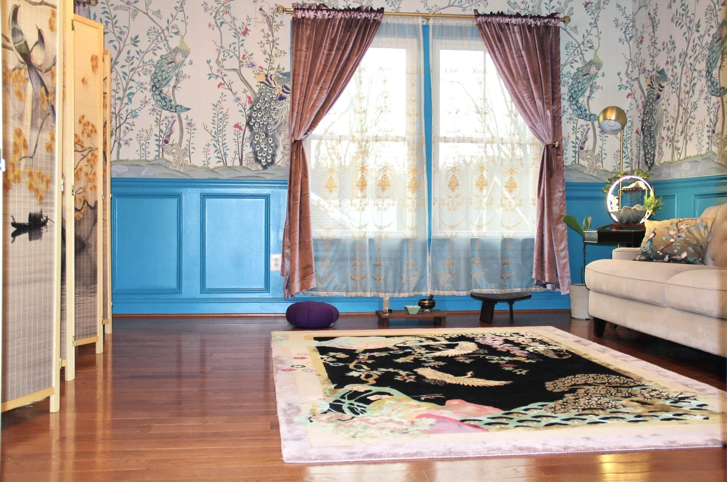 The silk chinoiserie wallpaper was carefully selected to coordinate with the rug, featuring elegant peacocks and botanical elements that symbolize prosperity, grace, and harmony. I also incorporated a room divider to subtly separate a functional workspace beyond, maintaining both practicality and visual continuity.