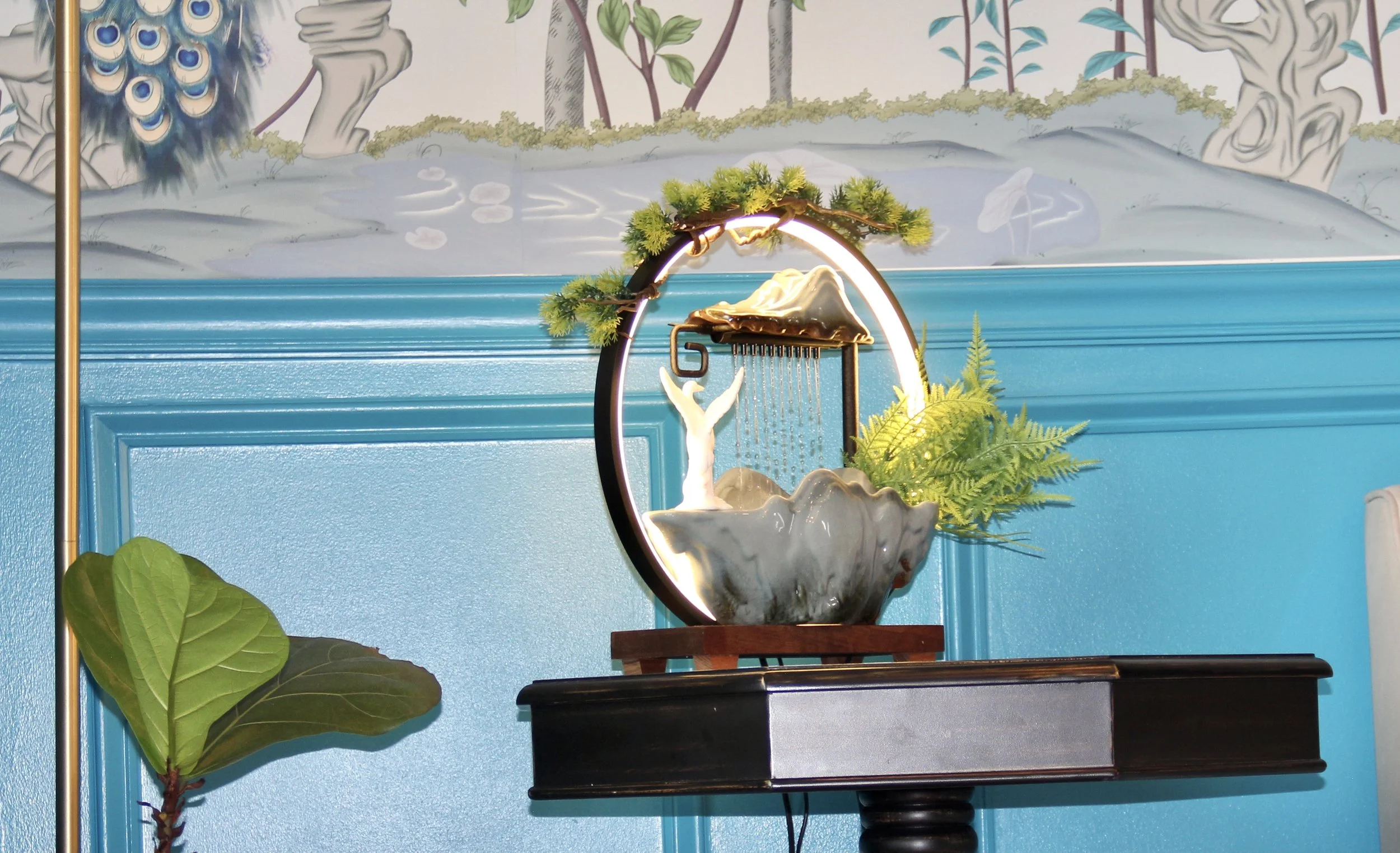 I designed every aspect of this space as a chinoiserie-inspired sanctuary, drawing from my background in interior design and my Bachelor of Arts degree. My intention was to create an environment that embodies the four elements: earth, water, fire, and air, while fully engaging all five senses in a cohesive and immersive way.
