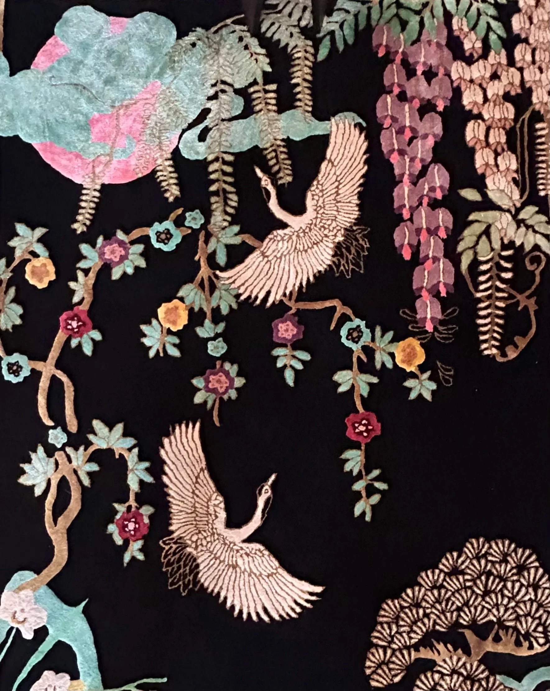 This interplay reflects the principle of yin and yang, where opposing forces exist in harmony, the upward movement of the cranes balanced by the gentle downward flow of the botanicals, strength softened by delicacy, light emerging from depth. Set against a deep, dark ground, each motif emerges with quiet luminosity, reinforcing this balance through contrast.