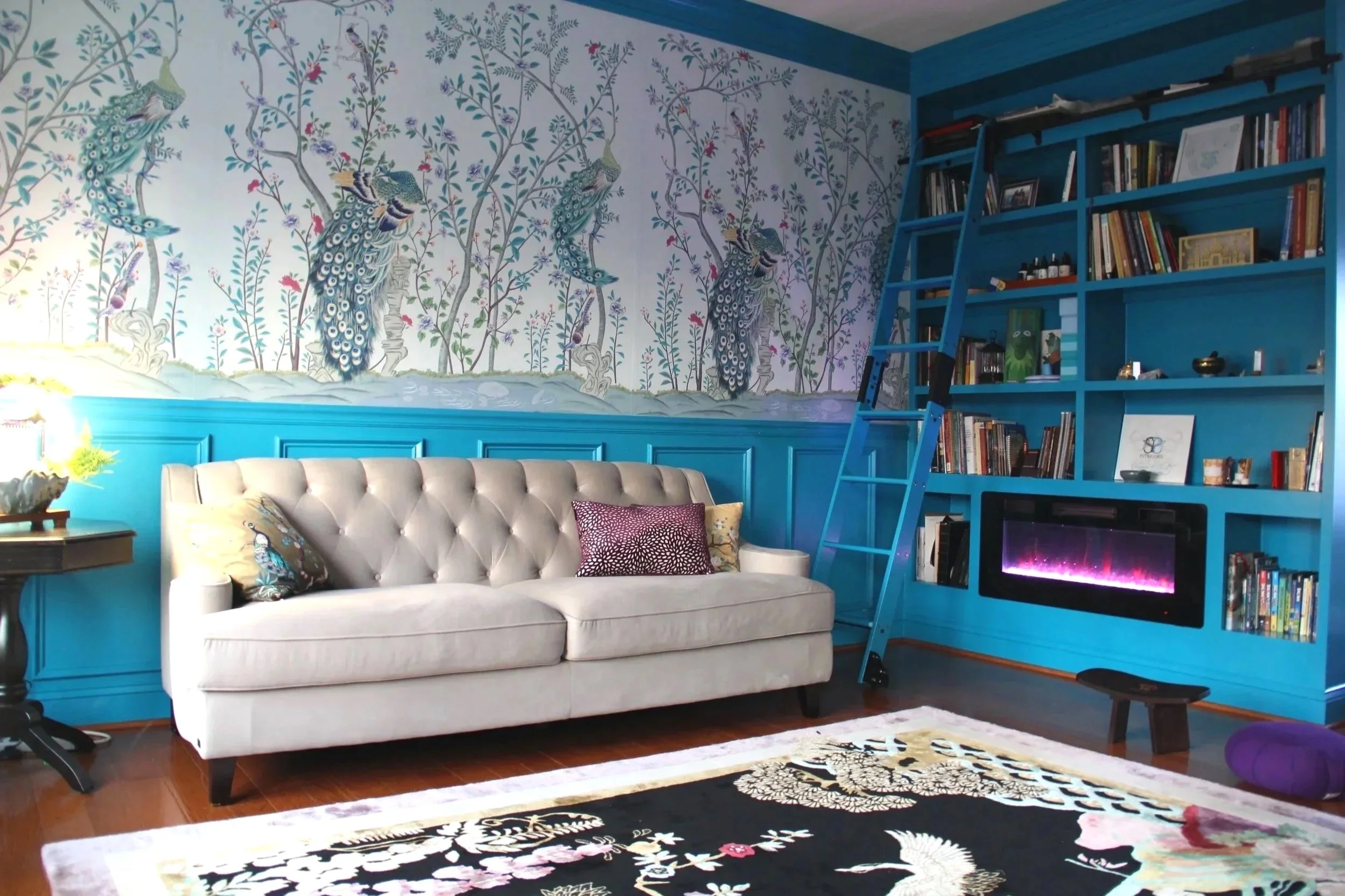 Rich teal architectural detailing, including custom wainscoting and built-in shelving with a library ladder, anchors the room and represents the fluid, calming energy of water. This is further enhanced by the presence of a tabletop fountain, which introduces gentle movement and sound, allowing the space to feel alive and emotionally grounding. The warmth of the natural wood flooring and the hand-tufted chinoiserie rug, imported from China, bring in the grounding qualities of earth through texture, craftsmanship, and organic pattern.
